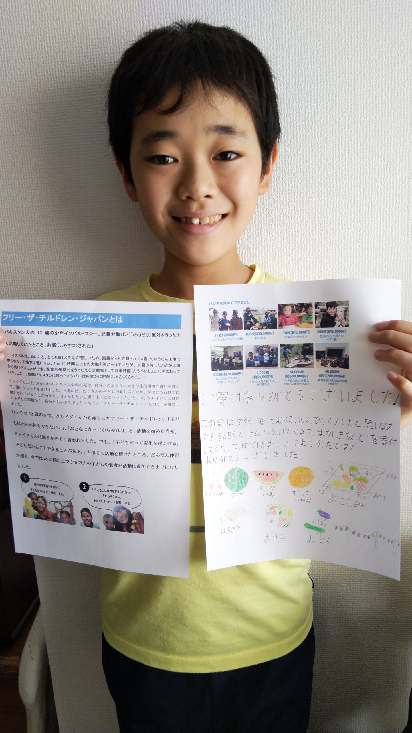 去年に行われた夏のオンラインキャンプで、「おうちdeアクション」というプログラムがあって、それでぼくの住んでいる住宅の一軒一軒をインターフォンを押して、FTCJの資料を見せながら、はがきや書き損じはがき、切手、テレフォンカードを集める事をやりました。