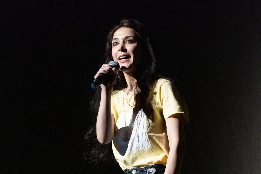 「世界では今、27か国以上で、戦争が起きている。」と静かに力強く話し始め、戦争の様子を伝えます。そして、「いかに戦争が残酷かを、いかに戦争がすべてを奪うかを、経験した女性がいる。平和を願い、そしてその大切さを伝えているサヘル・ローズさんです。」とステージが暗転すると、俳優のサヘル・ローズさんが現れました。