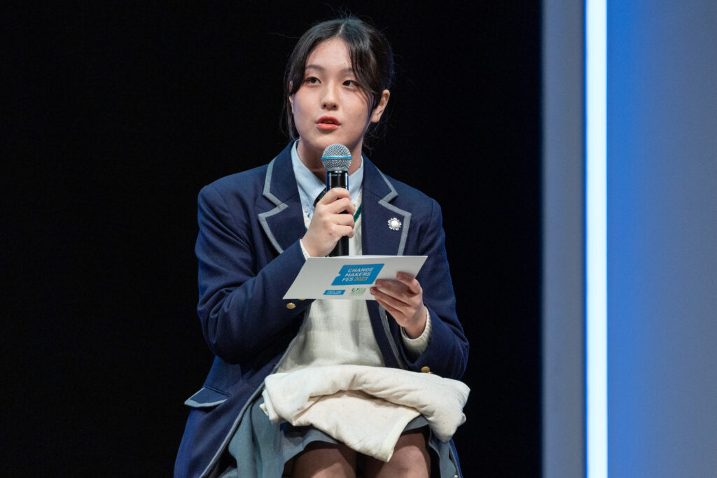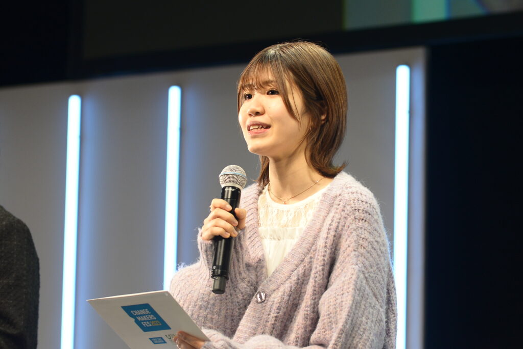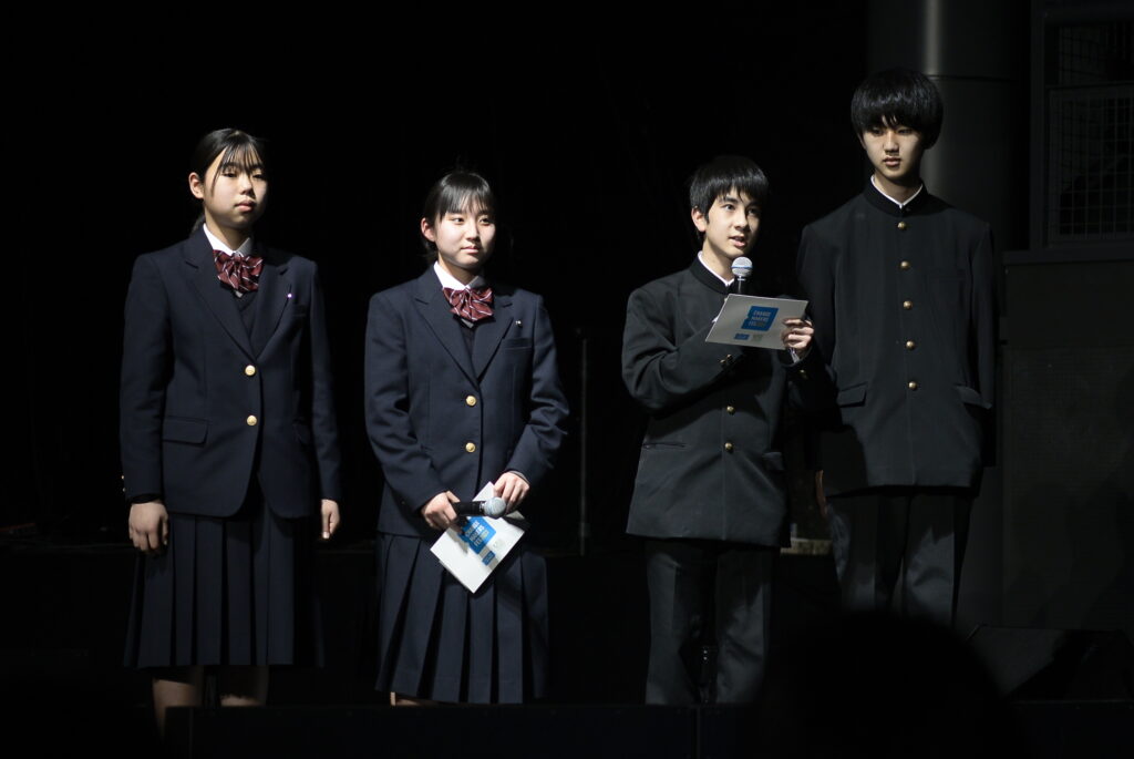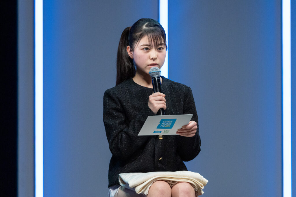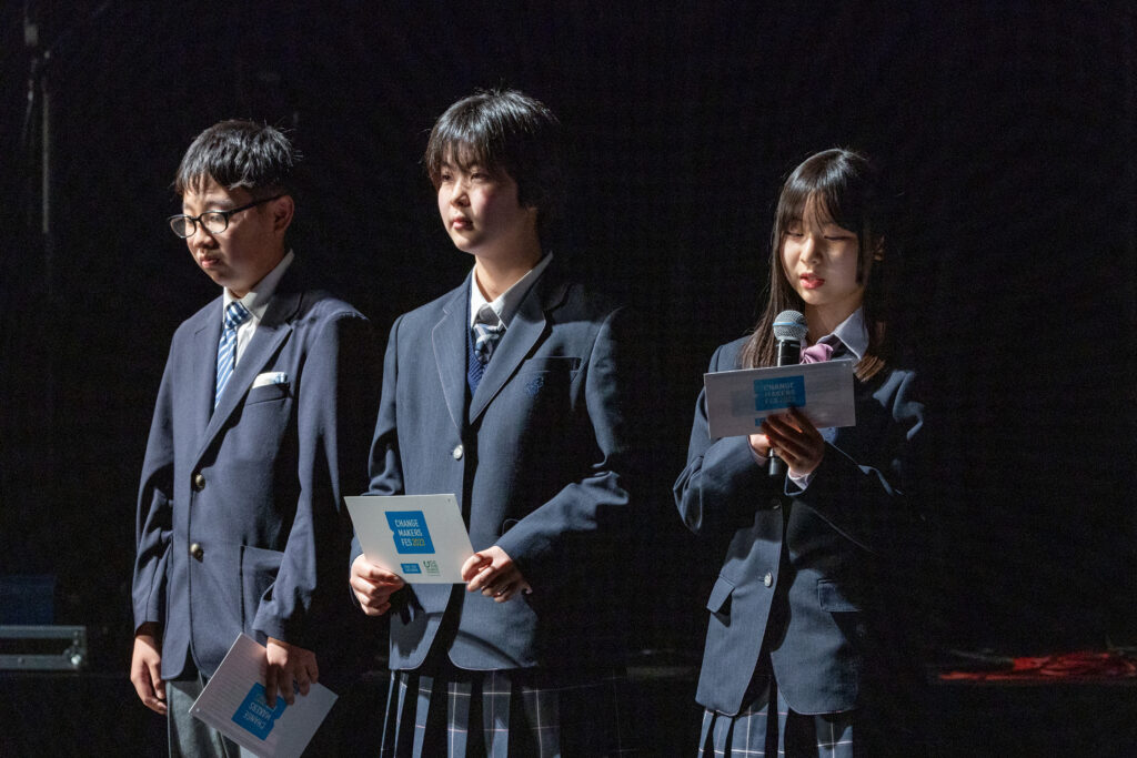 続いて、チェンジメーカーからのショートスピーチコーナーには3校が登場し、それぞれが起こしたアクションの報告をしました。