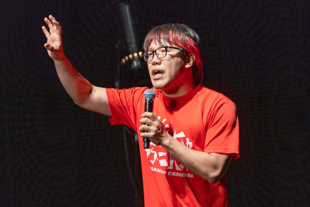 続いて、スクリーンには、沖縄の美しい海をバックに笑いを通して社会問題に物申す、お笑い芸人兼YouTuberのせやろがいおじさんの姿が。「お〜い!チェンジメーカーフェスに参加しているみなさ〜ん!伝えたいことあるから聞いて〜」と動画が流れ出し、動画でメッセージを送るかと思いきや、やっぱり生で伝えたいと、途中で本人がステージに登場!