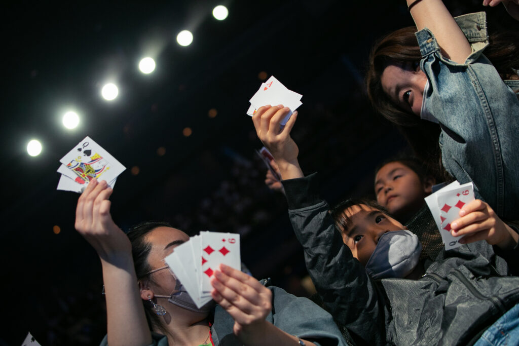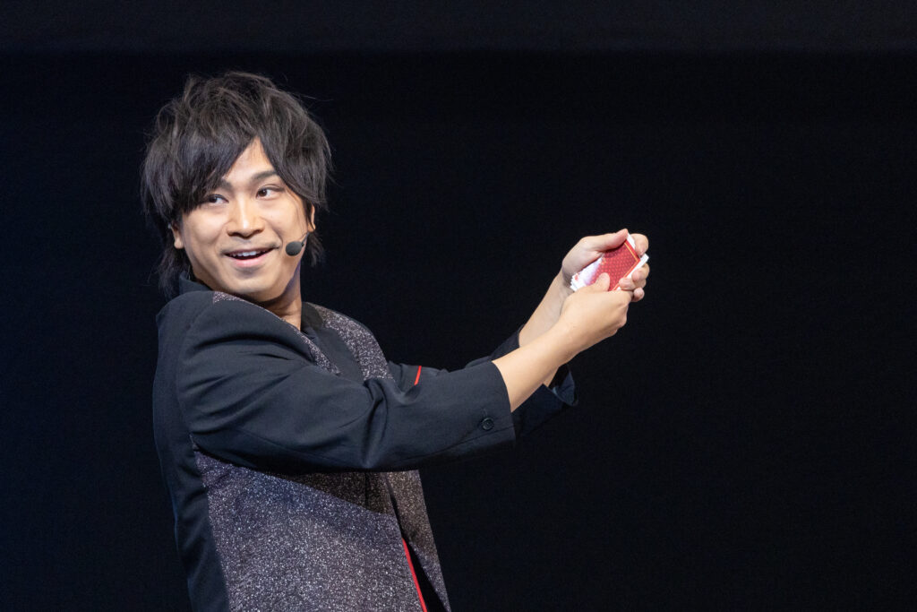 ここで再び、素晴らしいオープニングイリュージョンを披露してくれたイリュージョニストHARAさんが登場し、今度は会場参加型のトランプマジックを実施しました。