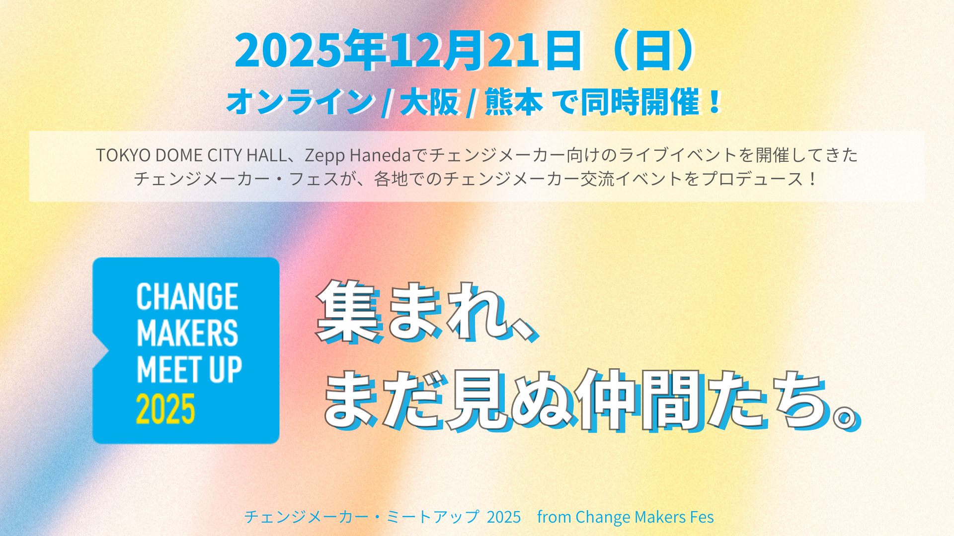 NEWS お知らせ 2025-08-29 お知らせ チェンジメーカー・ミートアップ2025 開催決定! チェンジメーカー・ミートアップ 2025 from Change Makers Fes 子ども・若者のソーシャルアクション(社会的な活動)を応援し、その成果を祝うチェンジメーカー・フェスが、今年は大阪&熊本&オンラインで交流イベントをプロデュース! 社会をもっと良くしたい!と行動する25歳以下の子ども・若者が集まり、互いの活動を報告し合い、著名人ゲストや同年代のチェンジメーカーとの交流を通して次のアクションへのモチベーションにつなげる場となります! 個人での参加はもちろん、部活動や委員会、有志グループでの参加も可能です。 =========================== 日時 :12月21日(日) 14:00-16:00 (予定) 会場 :オンライン及び対面会場(大阪・熊本) 費用 :無料 対象:社会問題に対してアクションを起こした25歳以下の子ども・若者 プログラム:活動の発表と意見交換、著名人との交流、著名人からのメッセージ、代表者スピーチなど 参加条件 :ソーシャルアクションレポート(活動内容の報告フォーム)の入力をしたうえで、イベントへの参加エントリーをすること。 ※ソーシャルアクションレポート登録時に、希望者に活動証明書を発行いたします。 =========================== イベント詳細は、今後ウェブサイト/イベント公式SNSで最新情報を公開! お楽しみに! お知らせ一覧
