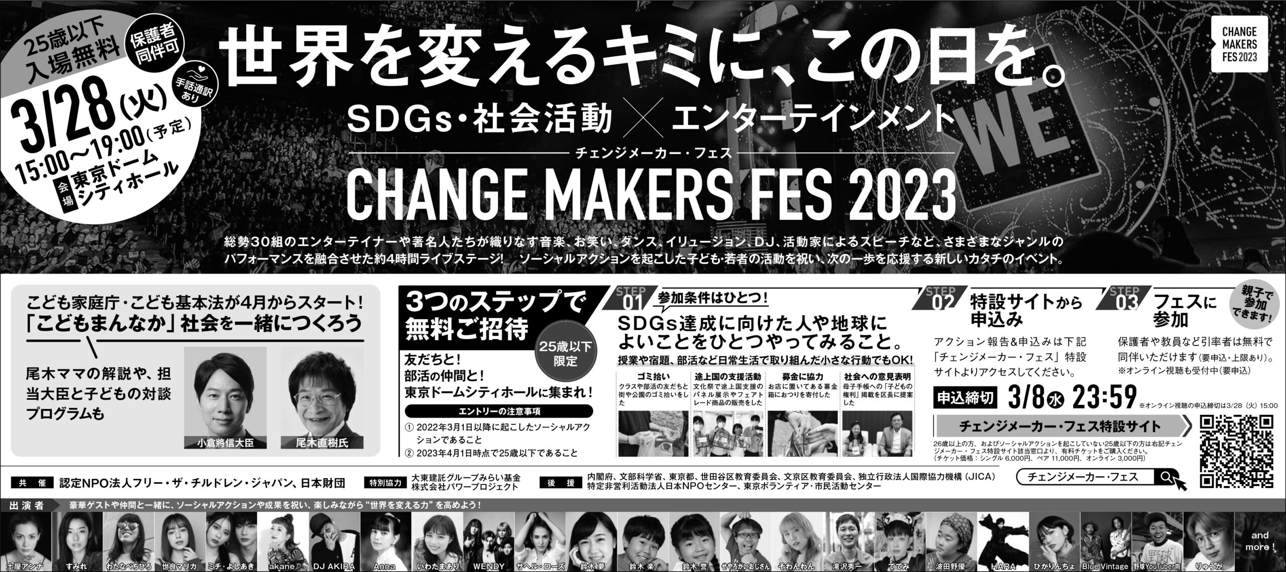 朝日学生新聞社が発行する「朝日小学生新聞」に『チェンジメーカー・フェス2023』の広告を掲載しました。東京ドームシティホールでの会場参加チケットのエントリーを3月8日(水)23:59まで受付しています。「SDGs達成に向けた人や地球によいことをひとつやってみること」という、参加条件を満たした25歳以下の参加費は無料です。保護者の同伴も無料ですので、ぜひお子様とご一緒にご参加ください。